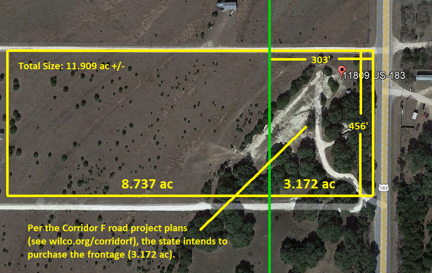 The tract is partially within proposed Corridor F schematic, which is the "expansion of US 183 from SH 29 to the Williamson County Line in Precinct 2 and Precinct 3". See images for a close up on the subject property's location in relation to Corridor F schematic (the full schematic is available on the Corridor F page on the Williamson County website). The county attorney has provided an "Engineer's Exhibit" that details the ROW area. Based on their numbers, the county would potentially acquire 3.172 ac +/- (456’ of HWY 183 frontage x 303’ ROW).